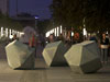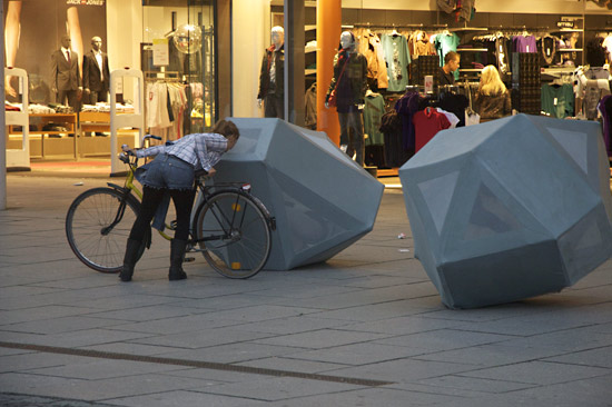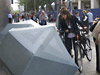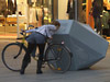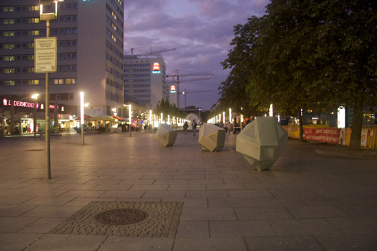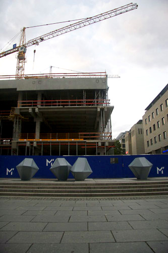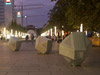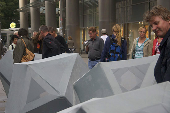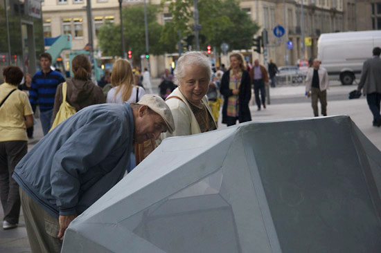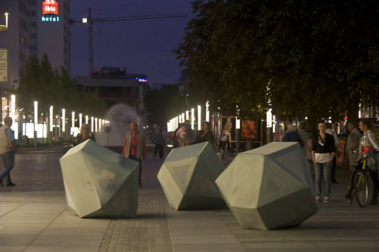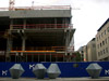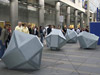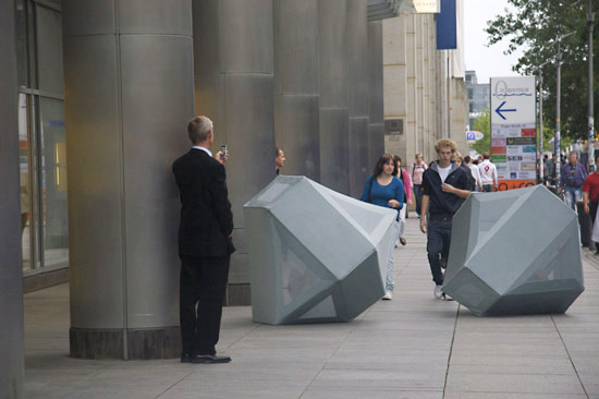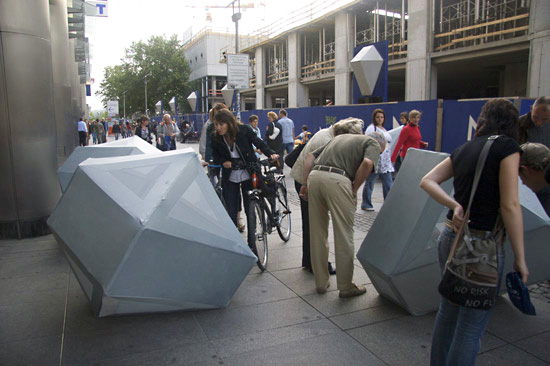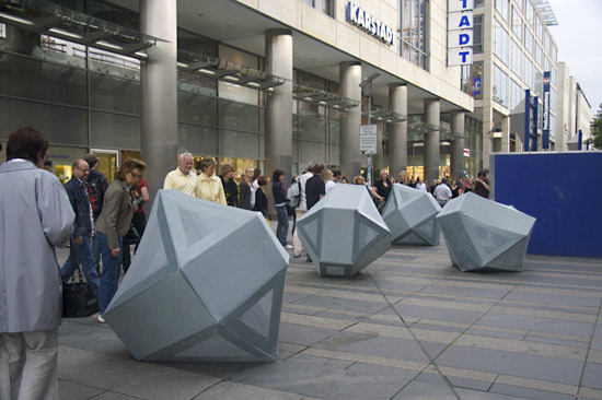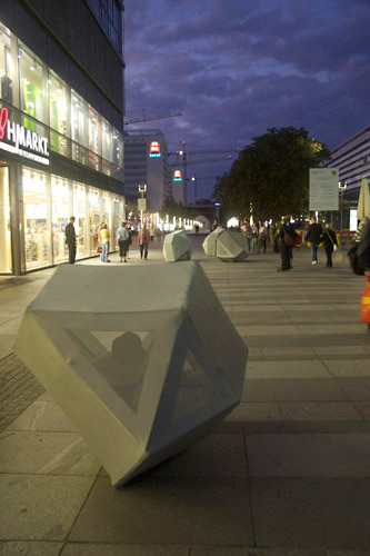 Building Blocks is a site-specific public performance and video project dealing with the architectural history of the Centrum Warenhaus. Located in the center of Dresden, the Centrum Warenhaus was a classic example of International-Style socialist architecture from the DDR. In 2007, the building was demolished to make way for a new shopping mall. In Building Blocks, four local dancers inhabited silver shapes modeled on elements from the missing building's distinctive aluminum "honey-comb" façade. The four traumatized fragments of the building briefly reconvened on their old ground, momentarily attempting to reassemble themselves. First congregating at the Centrum construction site, the shapes eventually dispersed and rolled away along the length of the Prager Strasse to the "Camouflash" exhibition site.