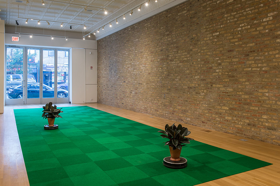 Two dancing Roombas bearing rubber trees vacuum on a sickly artificial green field. With an instrumental version of "High Hopes," a children's song made famous by Frank Sinatra, playing in the background, the robotic vacuums's algorithmic movements appear intentionally choreographed. They pirouette tirelessly across the bright green indoor/outdoor carpet tiles, mimicking the fortitude of the "little old ant" in the song. While mapping the gallery's perimeter, they start to flirt and snuggle with onlookers.