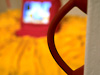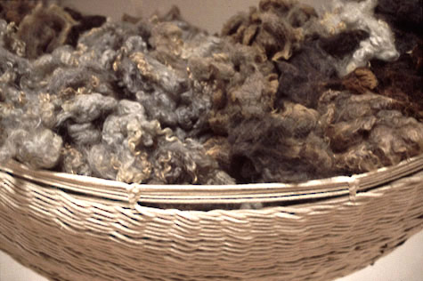 This piece is about symmetries that don't quite meet up. Nearly identical things fail to line up perfectly, causing slippages across meanings. Puns hinge on this doubling and slippage in language. Other imperfect symmetries span materials: raw fleece translates to black synthetic yarn; black yarn translates to the dyed black hair of the women; the twin-like women translate into each other; their playful game translates into an obsession. Flanking the wide entrance to the installation room are two red handles made out of rubber. Although the handles can be pulled and stretched, the entrance is slightly wider than the average person's arm span: from either side, a handle is just out of reach. Further, when one grabs onto a handle, it wobbles. The pun here is that it is impossible to get a solid "handle" on the piece.