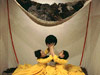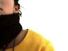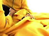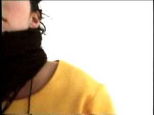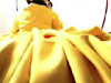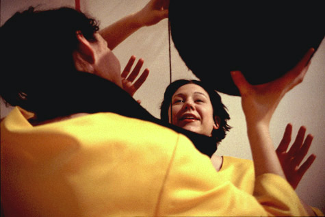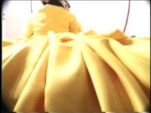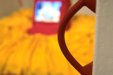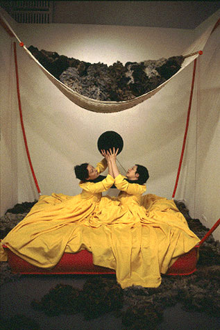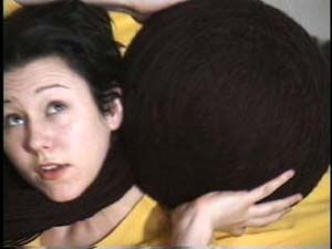 Two female performers sit on a raft-like mattress wearing a conjoined dress. The dress is voluminous and yellow; the mattress is pink; their hair is dyed black. The two pass a giant ball of black yarn back and forth, winding it in a figure eight around their necks. As they repeatedly pass the ball, mutually producing a form that attempts further attachment, the women tell each other bad, one-liner puns. Overhead is a sagging hammock, piled with raw fleece. More fleece swirls as though in eddies on the floor.