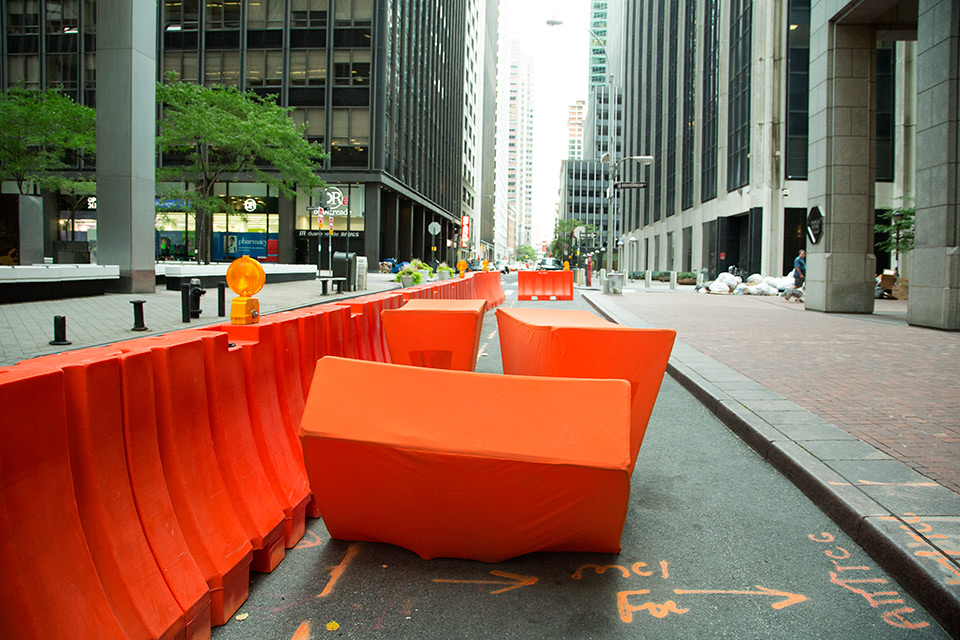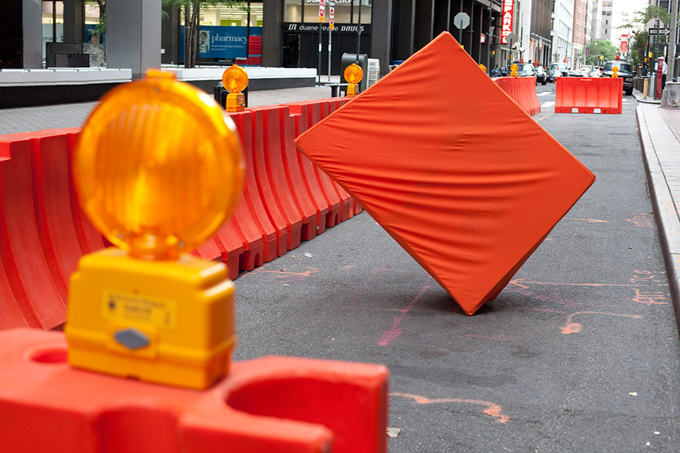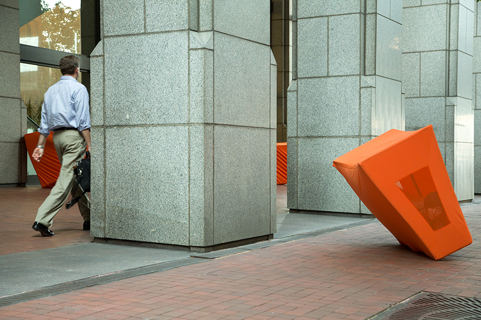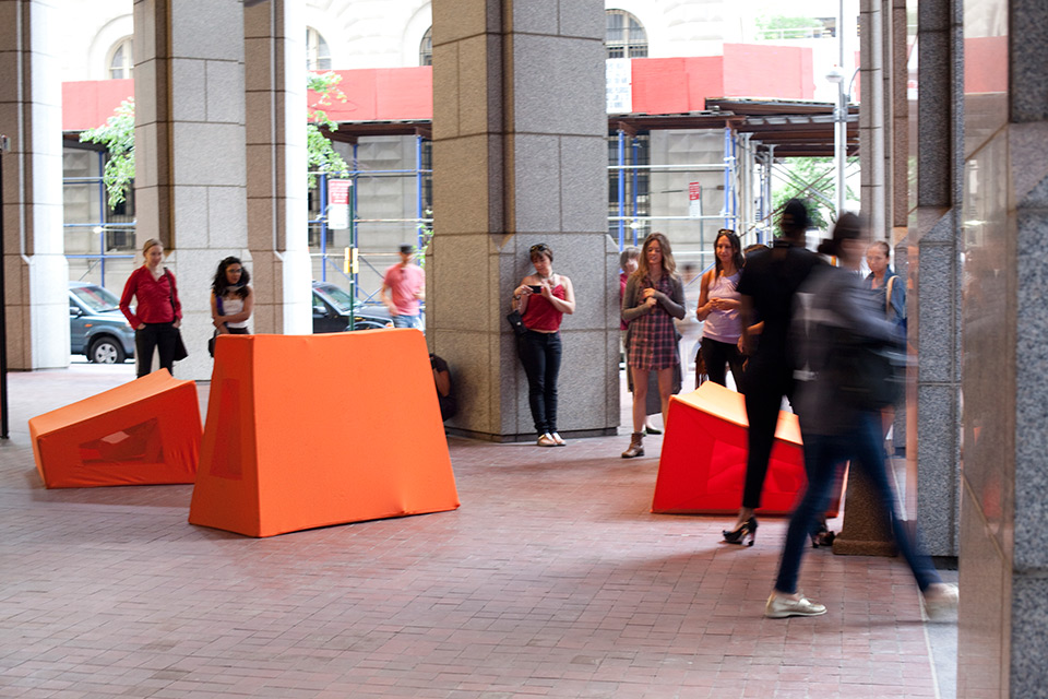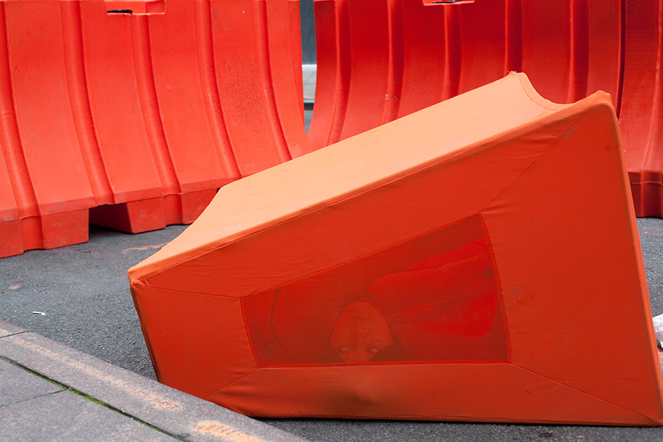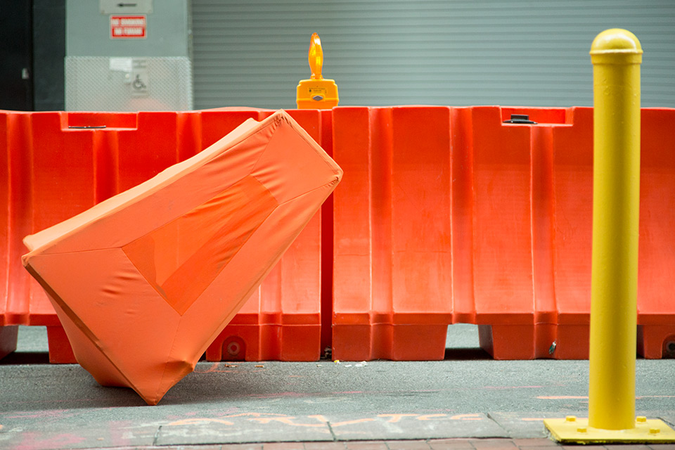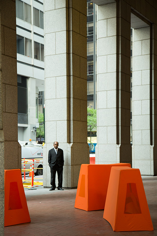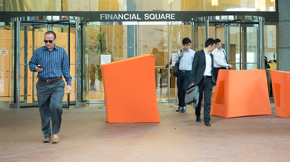I was initially invited to make a performance in response to the destruction wrought by Hurricane Sandy in the Wall Street district of lower Manhattan. However, nine months after the hurricane, I found that most damages had been completely repaired. Glass, steel, concrete, and granite had healed over any evidence of vulnerability in the urban landscape. Wall Street's monumental buildings seemed invincible until a Jersey barrier in front of 32 Old Slip caught my attention. The orange plastic shapes struck me as a futile defense mechanism. A haphazard effort to reinforce the building's property demarcations seemed to have the opposite effect: recalling precarious past moments like 9/11, Sandy, and Occupy.