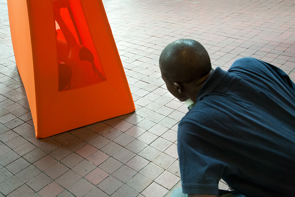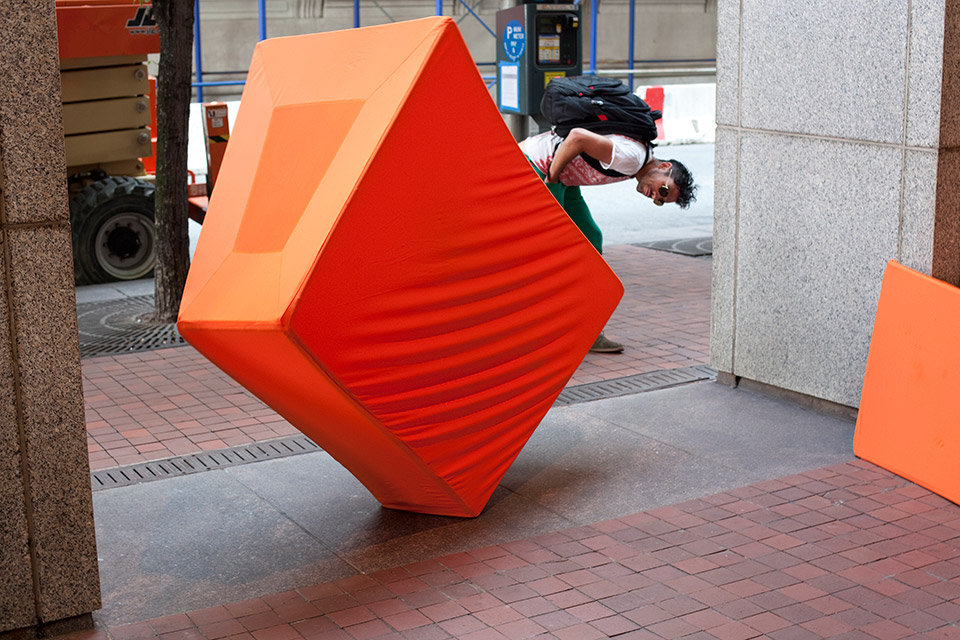Street.s/wall.ing/in is a site-specific performance designed for the building at 32 Old Slip in Manhattan's Wall Street district. Dancers occupy orange shapes inspired by Jersey barriers: transient urban architectural forms that evoke construction, warning, and repair. Over the course of two and a half hours, the shapes gradually traverse the building's perimeter, tumbling and flipping against the wind, and clustering around the granite pillars of the building's arcade. Departing from the East River, they eventually arrive at a Jersey barrier cordoning the Northwest corner of the building. The performance concludes with the shapes' amassing in the barrier's furthermost nook.