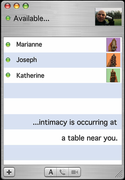 Intimate Architectures is a series of Instant Messaging performances which culminated with Connecting, a 3-channel, 4-city performance which streamed live on April 1, 2005 at www.debalie.nl/connecting.